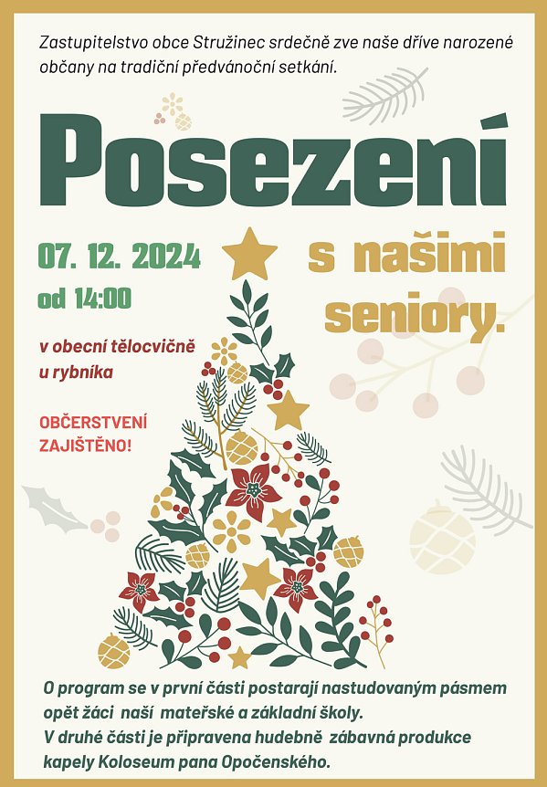 Zastupitelstvo obce Stružinec zve dříve narozené spoluobčany na tradiční předvánoční setkání s našimi seniory. Letos se odpolední posezení v obecní tělocvičně u rybníka uskuteční v sobotu 7. prosince od 14. hodin. O program se v první části odpoledne postarají nastudovaným pásmem opět žáci naší základní a mateřské školy, poté, po malém občerstvení, bude následovat hudebně zábavná produkce.