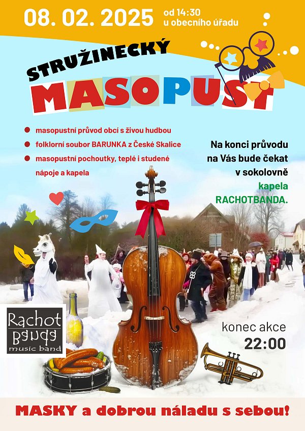 Obec Stružinec vás chce všechny pozvat na MASOPUSTNÍ průvod obcí s živou hudbou.