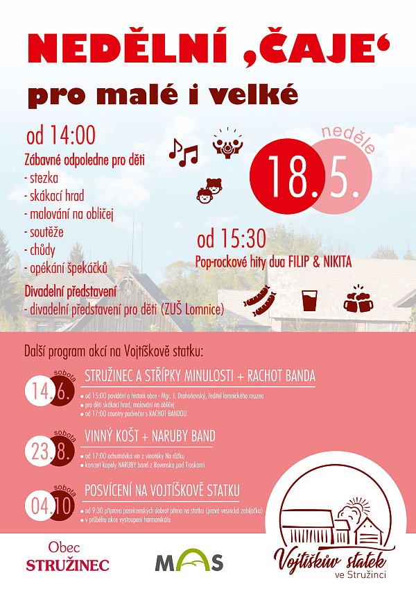 Pro děti bude připraven skákací hrad, malování na obličej, stezka a soutěže. Těšit se můžete i na divadelní představení a také na pop-rokové hity dua Filip a Nikita. Po celou dobu bude pro všechny příchozí připraveno bohaté občerstvení.